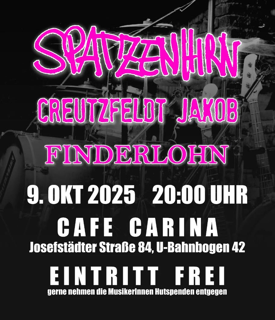 Wir geigen mal wieder auf. Juhu! Am 9.10.2025 im Cafe Carina mit Spatzenhirn und Finderlohn. Schaut's vorbei es wird a Hetz!